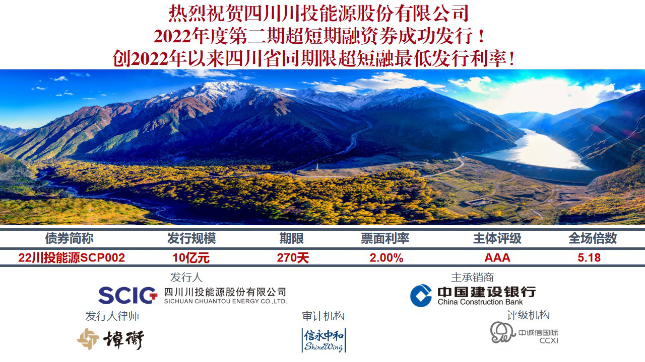 2022年8月3日,川投能源成功發(fā)行2022年度第二期超短期融資債券,總金額10億元,期限270天,利率2.0%,全場(chǎng)倍數(shù)5.18倍,創(chuàng)2020年以來四川省同期限超短融最低發(fā)行利率。