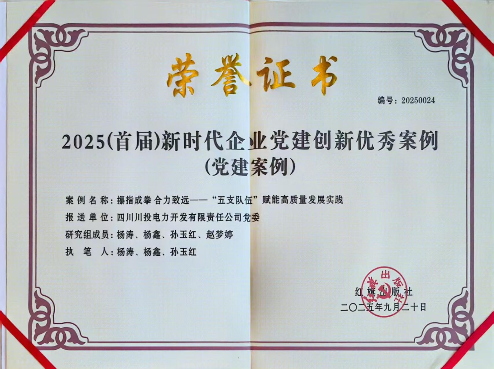 9月20日,由紅旗出版社主辦的2025(首屆)新時(shí)代企業(yè)黨建經(jīng)驗(yàn)交流會(huì)暨企業(yè)黨建創(chuàng)新優(yōu)秀案例發(fā)布儀式在北京舉行。川投能源所屬川投電力黨委申報(bào)的案例《攥指成拳 合力致遠(yuǎn)——“五支隊(duì)伍”賦能高質(zhì)量發(fā)展實(shí)踐》,從1400余家企業(yè)中脫穎而出,成功入選本屆黨建創(chuàng)新優(yōu)秀案例。