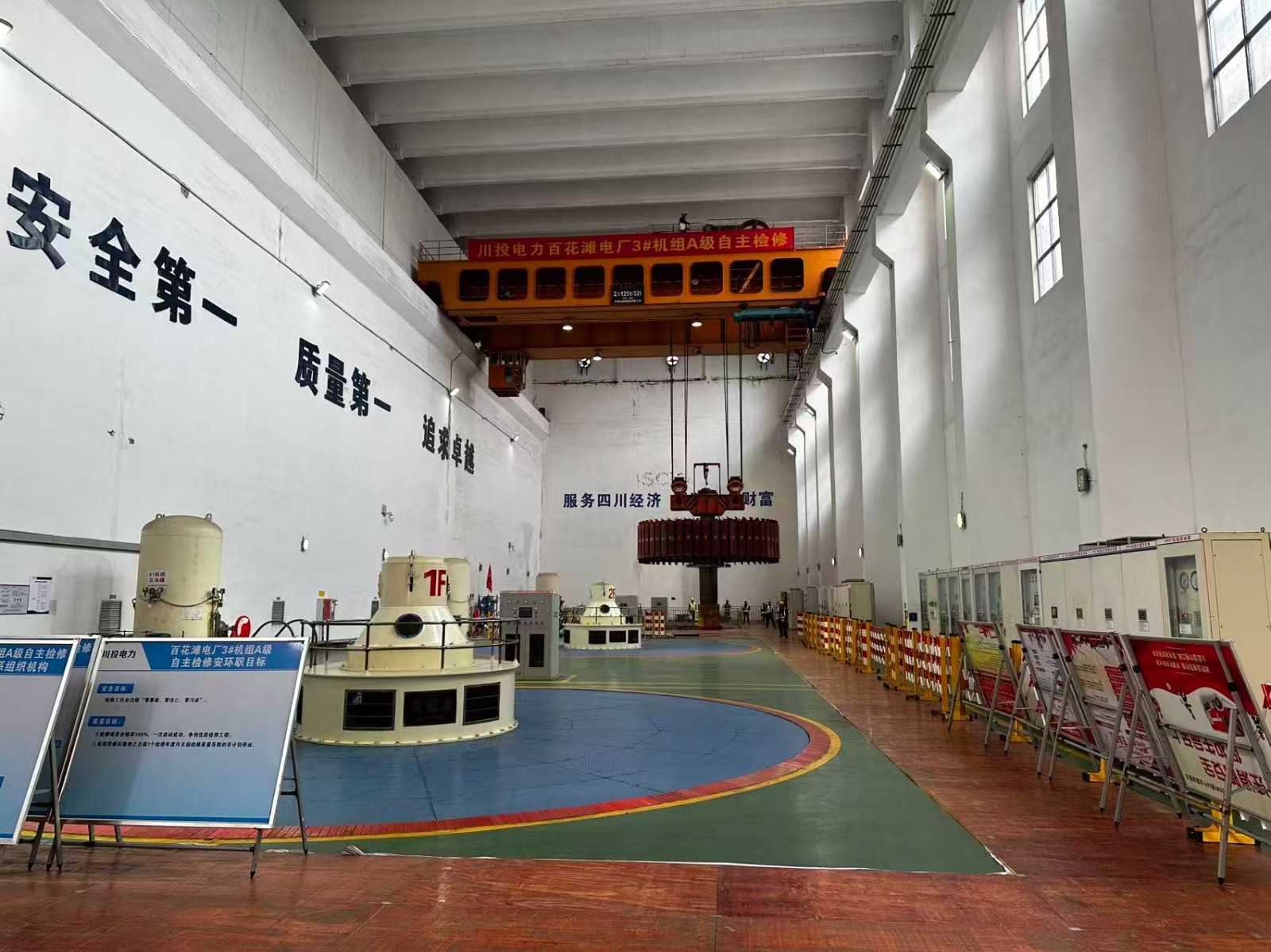 9時16分,起吊工作正式啟動,川投電力黨委副書記、總經(jīng)理蔡承德,川投電力黨委委員、副總經(jīng)理王偉,川投電力副總經(jīng)理陳云明及生技部、安環(huán)部相關(guān)人員現(xiàn)場指導(dǎo)工作。作業(yè)過程中,現(xiàn)場指揮指令精準(zhǔn),操作人員默契配合,起重、監(jiān)護(hù)、技術(shù)保障等各崗位人員各司其職、協(xié)同作戰(zhàn)。從轉(zhuǎn)子固定、吊具連接到起吊轉(zhuǎn)運(yùn),每一步操作都嚴(yán)格按照技術(shù)規(guī)范,穩(wěn)步推進(jìn)。全體參檢人員全神貫注、密切監(jiān)控設(shè)備運(yùn)行狀態(tài)和轉(zhuǎn)子起吊姿態(tài),及時應(yīng)對可能出現(xiàn)的突發(fā)情況,確保整個吊轉(zhuǎn)子過程安全、平穩(wěn)、有序。